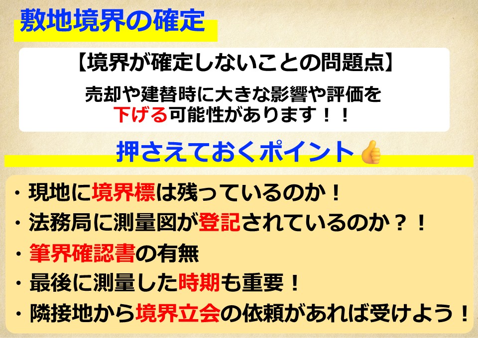 ⇒対象となる不動産の隅々に境界線の目印が残っていると手続きや問題が軽減されます。逆に目印が欠損している場合は注意が必要です。